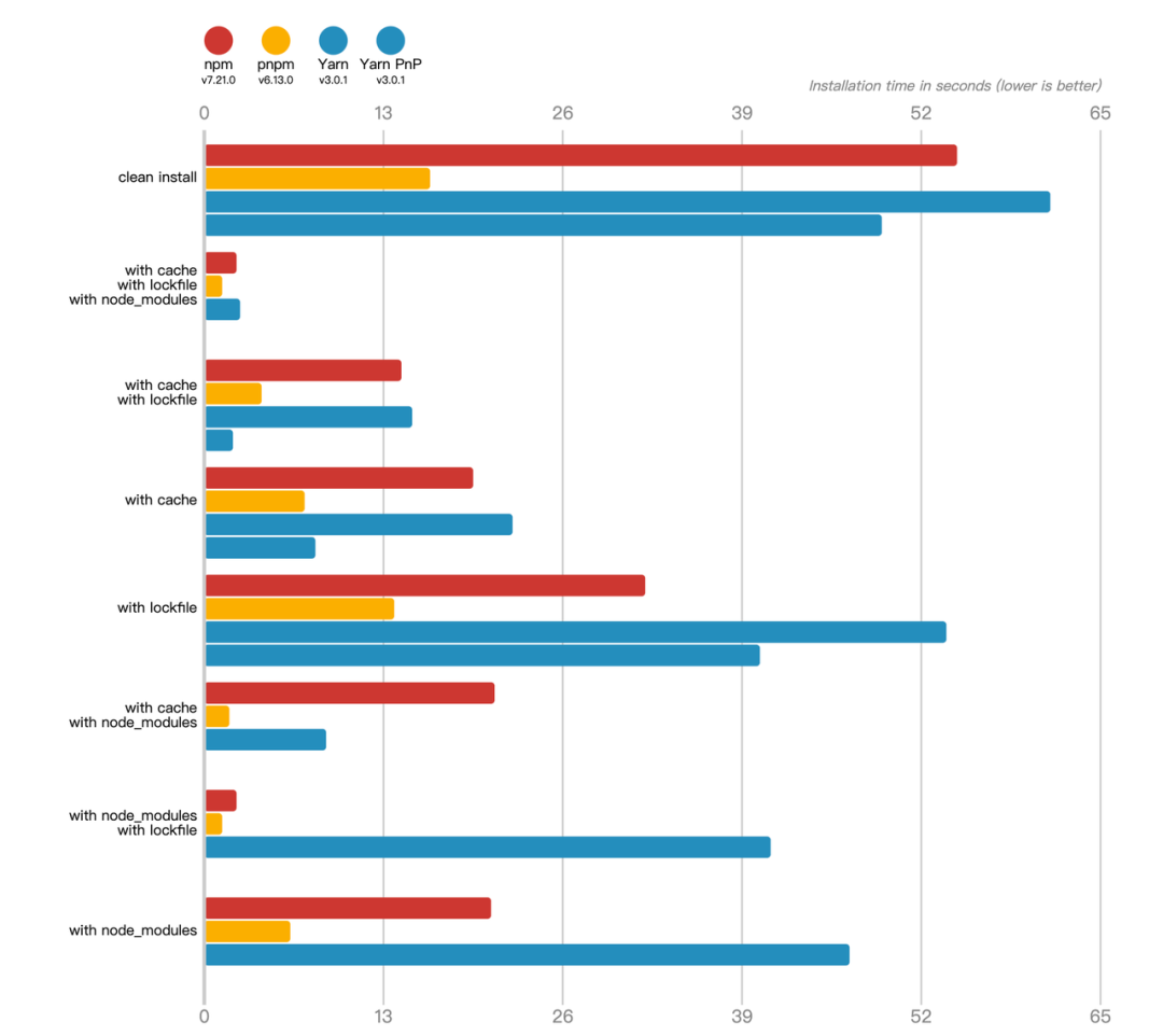 根据目前官方提供的 benchmark[2] 数据可以看出在一些综合场景下比 npm/yarn 快了大概两倍: