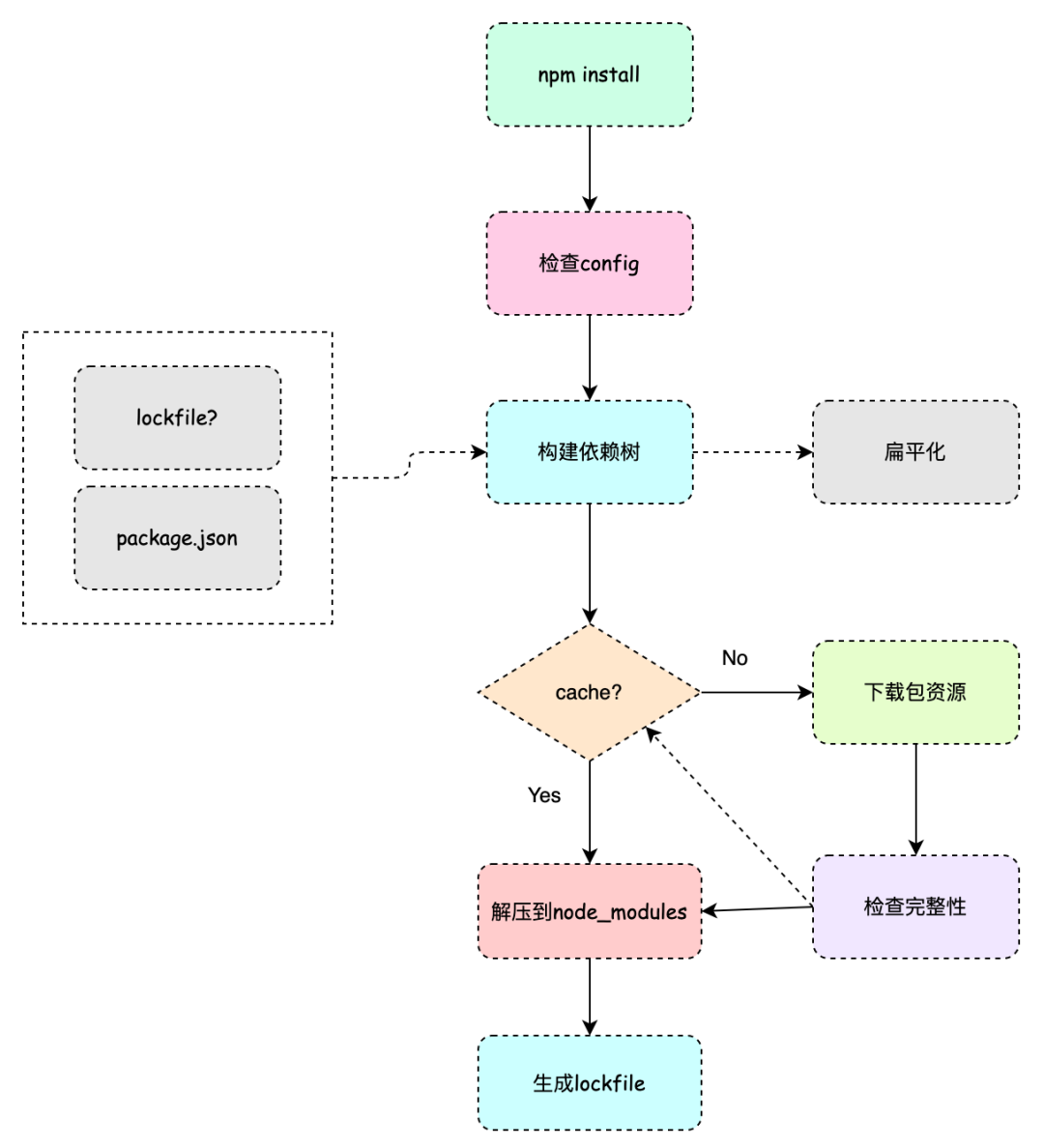 package-lock.json。若存在,进行版本比对,处理方式和 npm 版本有关,根据最新 npm 版本处理规则,版本能兼容按照 package-lock 版本安装,反之按照 package.json 版本安装;若不存在,根据package.json确定依赖包信息。检查缓存或下载:判断是否存在缓存。若存在,将对应缓存解压到 node_modules 下,生成