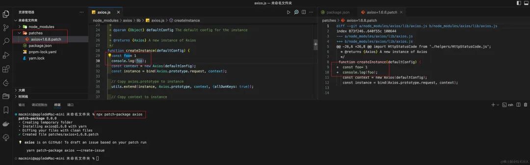 npx patch-package axios执行这个命令后,patch-package 会在项目的根目录下创建一个 patches 目录(如果还没有的话),并在里面生成一个名为 axios + 版本号. patch 的文件,其中版本号是你项目中使用的 axios 的版本。
