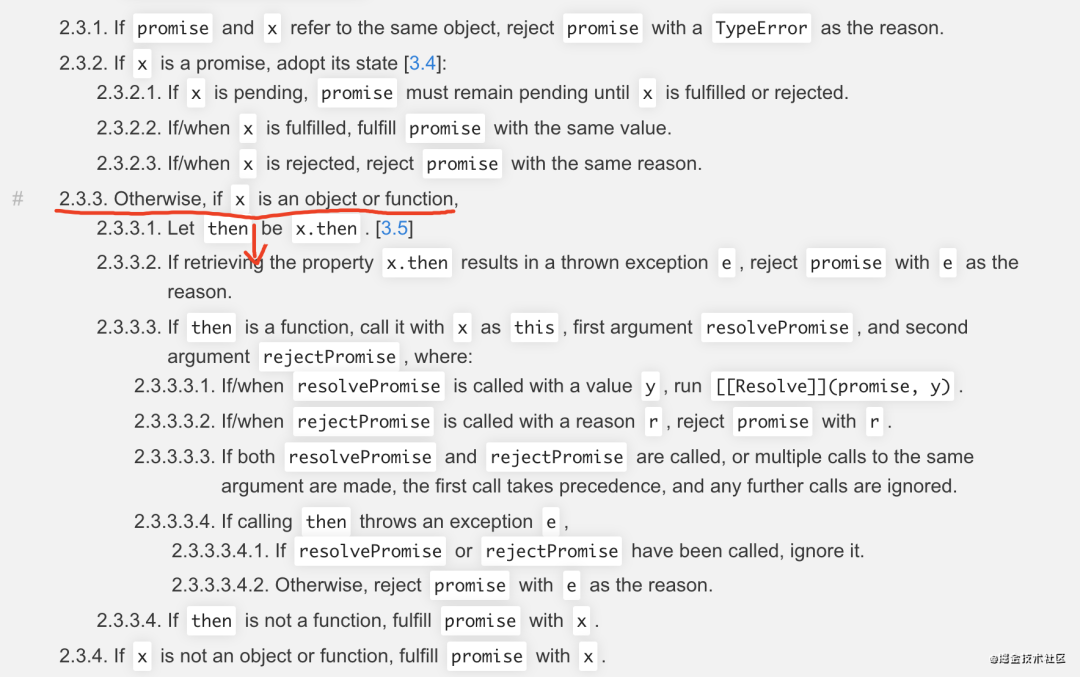 自红线向下的细节,我们都没有处理,这里要求判断 x 是否为 object 或者 function,满足则接着判断 x.then 是否存在,这里可以理解为判断 x 是否为 promise,这里都功能实际与我们手写版本中 x instanceof MyPromise 功能相似。