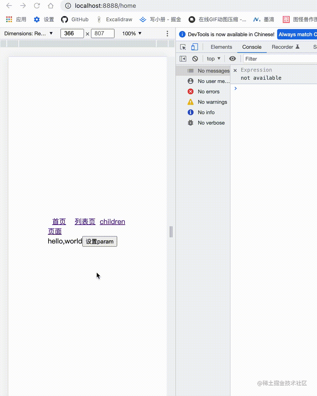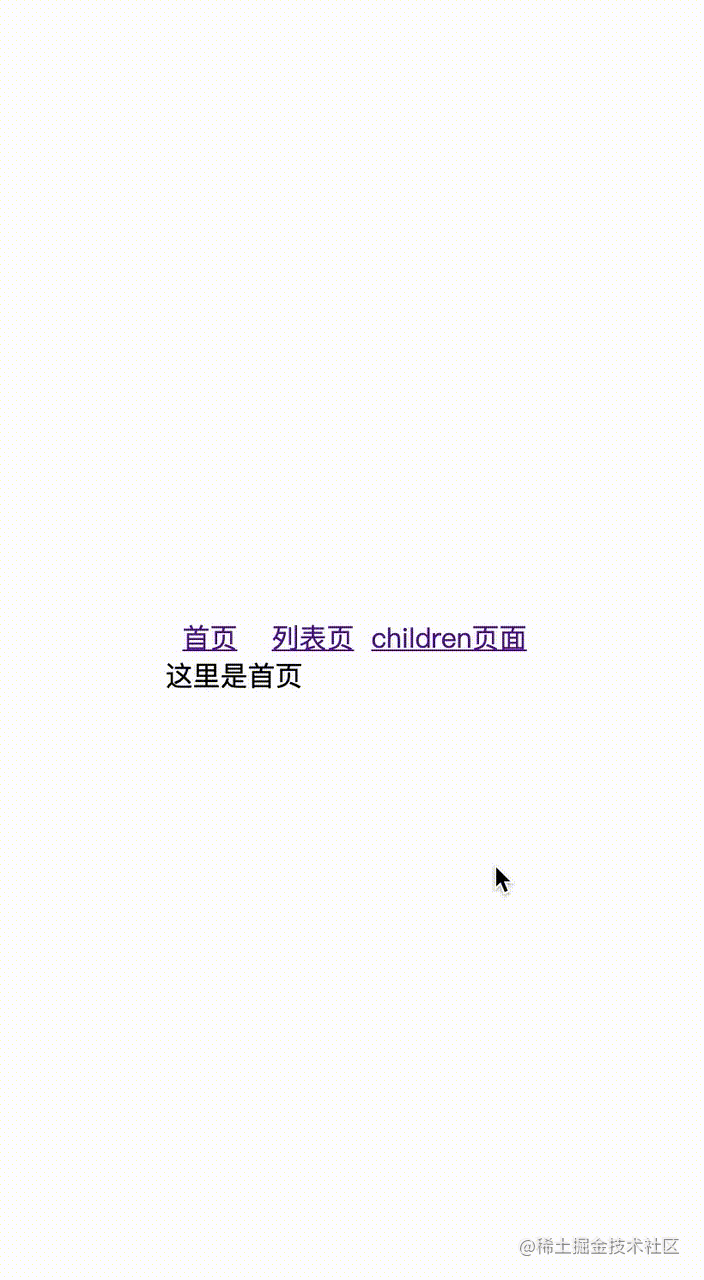 function Children (){ return <div> 这里是 children 页面 <Menus /> <Route component={Child1} path="/children/child1" /> <Route component={Child2} path="/children/child2" /> </div>}- 可以看到在