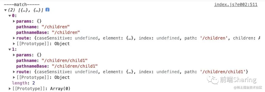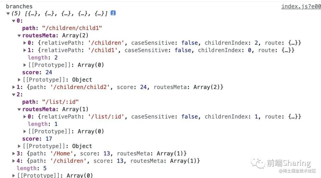 matchRoutes,找到匹配的路由分支。,什么叫做匹配的路由分支呢,比如上面的切换路由到/children/child1,那么明显是一个二级路由,那么它的路由分支就应该是 root -> children -> child1。我们打印 matches 看一下数据结构。