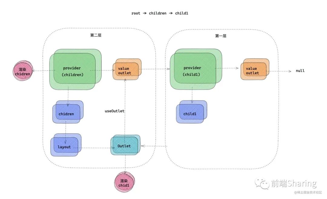 1 首先通过 provider 包裹 child1,那么 child1 真正需要渲染的内容 Child1 组件 ,将被当作 provider 的 children,最后把当前 provider 返回,child1 没有子路由,所以第一层 outlet 为 null。