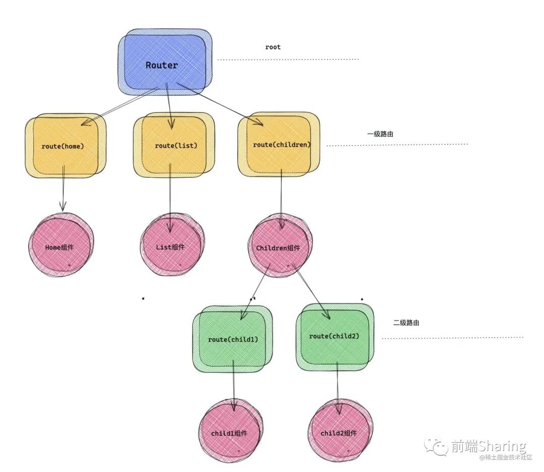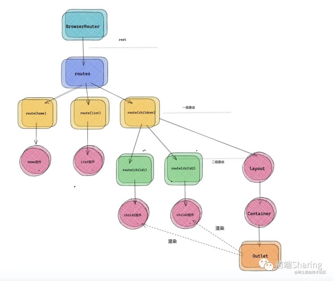<Routes> <Route element={<Home />} path="/home" /> <Route element={<List/>} path="/list" /> <Route element={<Layout/>} path="/children" > <Route element={<Child1/>} path="/children/child1" /> <Route element={<Child2/>} path="/children/child2" /> </Route></Routes>我们带着两个问题去思考。