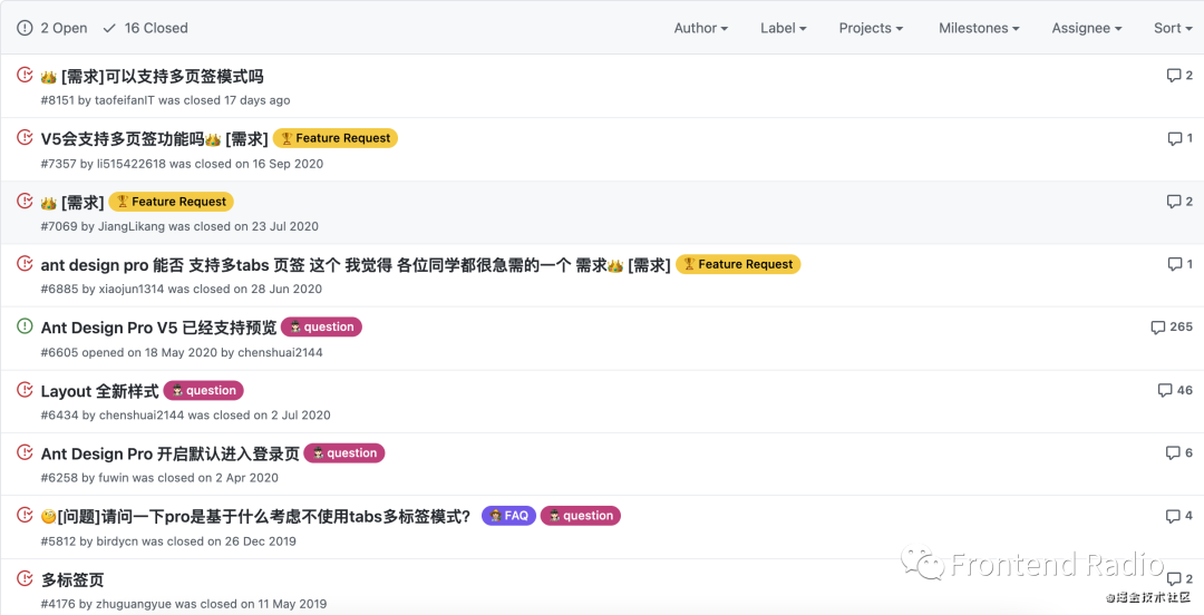 社区上关于多页签的需求呼声也非常高,但是如 React 社区比较出名的中后台方案 Ant Design Pro 也不支持该功能,两年没看,至今仍然有很多 Issue 提出这类需求: