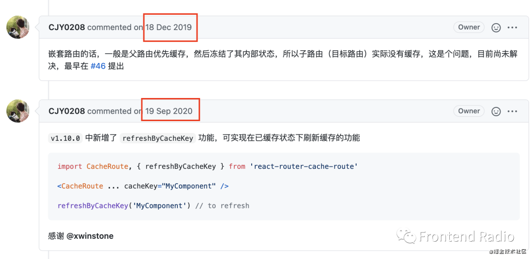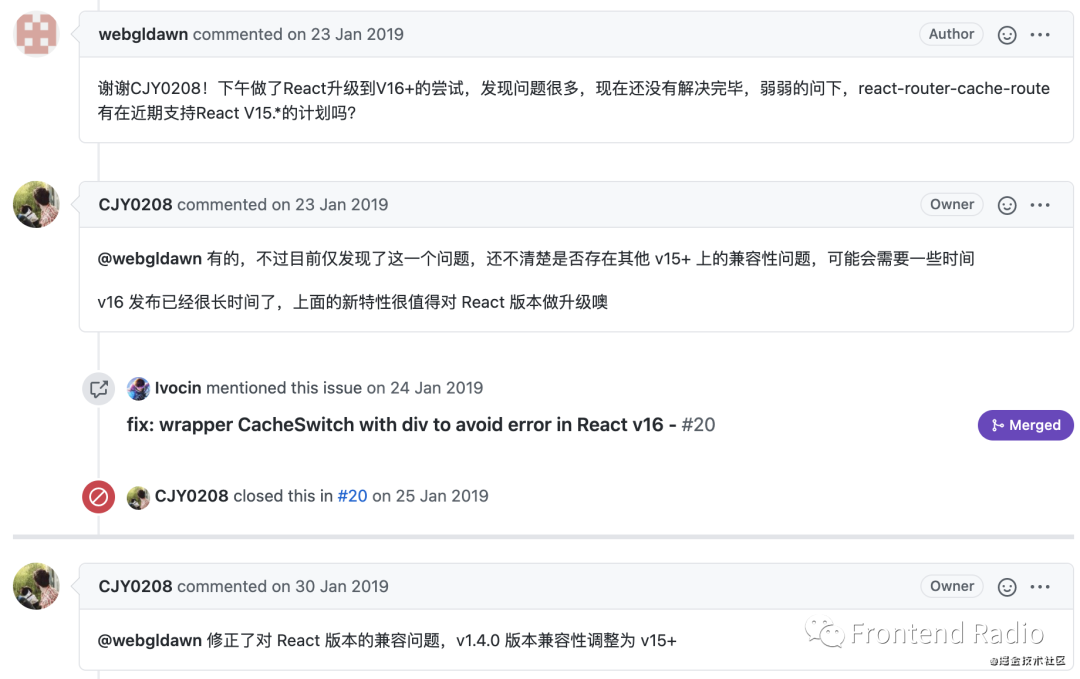 项目组深度使用 react-router-cache-route 两年时间了,期间由于 React 和 React Router 版本迭代也出现过一些问题,好在 react-router-cache-route 的作者一直保持更新,解决了很多棘手的问题。