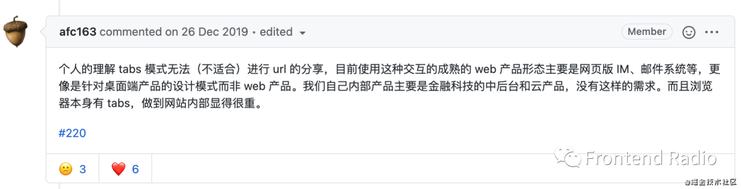 这个解释我个人并不完全认同。首先说 “tab 模式无法(不适合)进行 url 的分享” 其实是不成立的, url 带路由和参数就能准确跳转到对应页面,这在我们系统和 Vue 的多页签系统里都是基本功能;而说浏览器本身有 tabs 就不需要做到网站内部,也比较片面,SPA 的页面不开浏览器 tab 应该更符合 Antd 的设计价值观:足不出****户 - Ant Design,就连最新版的 Chrome 都已经支持 “群组” 功能了,让用户在 SPA 页面尽量不开浏览器页签才应该是更好的体验设计。