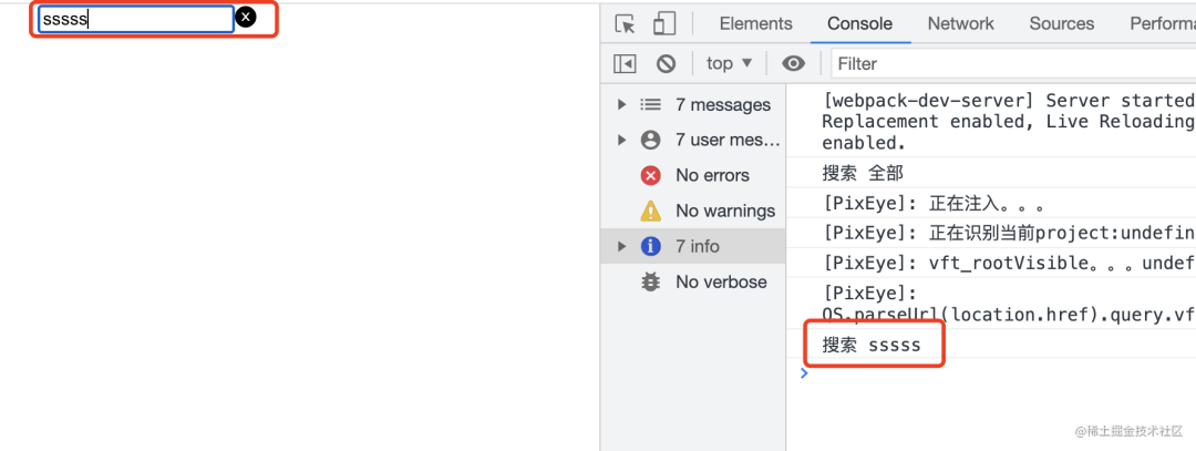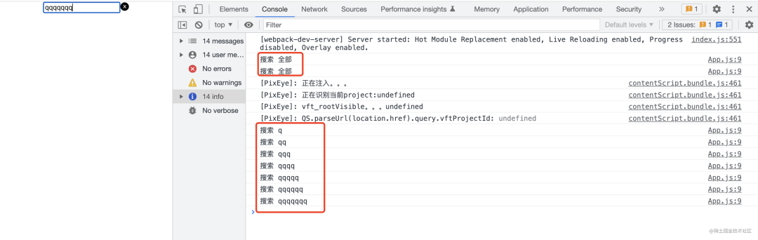 import { Input } from 'antd'import { useEffect, useState } from 'react'import './App.css'function App() { const [val, setVal] = useState('') const onSearch = (val) => { console.log('搜索', val || '全部') } const onChange = (e) => setVal(e.target.value) // 当 val 发生变化时,请求搜索数据 useEffect(() => { onSearch(val) }, [val]) return ( <div className='App'> <Input value={val} placeholder='请输入' onChange={onChange} allowClear /> </div> )}这时可以看到,首次进入页面,会发起 2 次查询全部的搜索数据请求,然后每次输入框更新,都会发起搜索数据的请求。