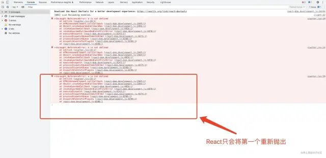 <div onClick={() => { console.log("b...", b); }}> <div onClick={() => { console.log("a..", a); }} > click me </div></div>复制代码当我们点击'click me' 时,React 会沿着冒泡阶段调用所有的监听函数,并捕获这些错误打印出来。但是,React 只会将第一个错误 ** 重新抛出 (rethrowCaughtError)**。可以发现下图中 React 捕获了这两个监听函数中的错误并打印了出来,但 React 只会将第一个监听函数中的错误重新抛出。