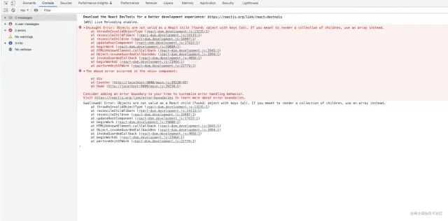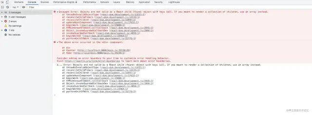 <div onClick={() => { setTimeout(() => { try { setCount({ a: 1 }); } catch (e) { console.log("e...", e); } }, 0); }}> {count}</div>复制代码exception-05.jpg
