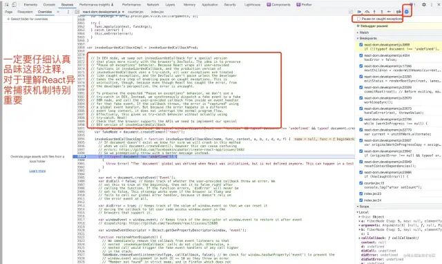 在生产环境中,invokeGuardedCallback 使用 try catch 捕获异常,因此所有的用户代码异常都被视为已经捕获的异常,不会被Pause on exceptions自动定位到,当然用户也可以通过开启 Pause On Caught Exceptions 自动定位到被捕获的异常代码位置。