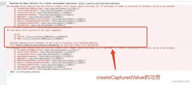 createCapturedValue从当前抛出异常的 fiber 节点开始往上找出所有的 fiber 节点并收集起来,用于在控制台打印 fiber 栈,如下: