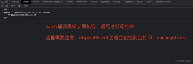 console.log("开始");try { console.log("aaaa", dd);} catch (e) { console.log("捕获异常...", e);}console.log("结束");复制代码exception-03.jpg