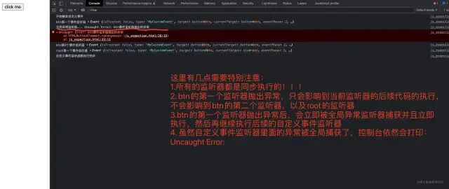 自定义事件监听器内部抛出的异常可以被全局异常监听器监听到并且会立即执行!!!!! 同时仍然可以被 Pause on exceptions 自动定位到,具体例子可以看这里 [11]