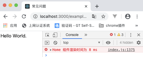 import React from 'react';// Home 组件class Home extends React.Component { render () { return (<h1>Hello World.</h1>); }}// HOCfunction withTiming (WrappedComponent: any) { let start: number, end: number; return class extends WrappedComponent { constructor (props: any) { super(props); start = 0; end = 0; } componentWillMount () { if (super.componentWillMount) { super.componentWillMount(); } start = +Date.now(); } componentDidMount () { if (super.componentDidMount) { super.componentDidMount(); } end = +Date.now(); console.error(`${WrappedComponent.name} 组件渲染时间为 ${end - start} ms`); } render () { return super.render(); } };}export default withTiming(Home);- 结果: