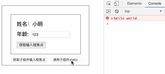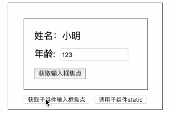 import * as React from 'react';import * as styles from './index.module.less';function HOC (WrappedComponent: any) { /* 省略无关代码... */ function wrappedComponentStaic () { WrappedComponent.sayHello(); } return (props: any) => ( <div className={styles.hocWrapper}> <WrappedComponent inputRef={(el: any) => { inputElement = el; }} {...props} /> /* 省略无关代码... */ <input type="button" value="调用子组件static" onClick={wrappedComponentStaic} className={styles.callButton} /> </div> );}export default HOC;- 效果如下: