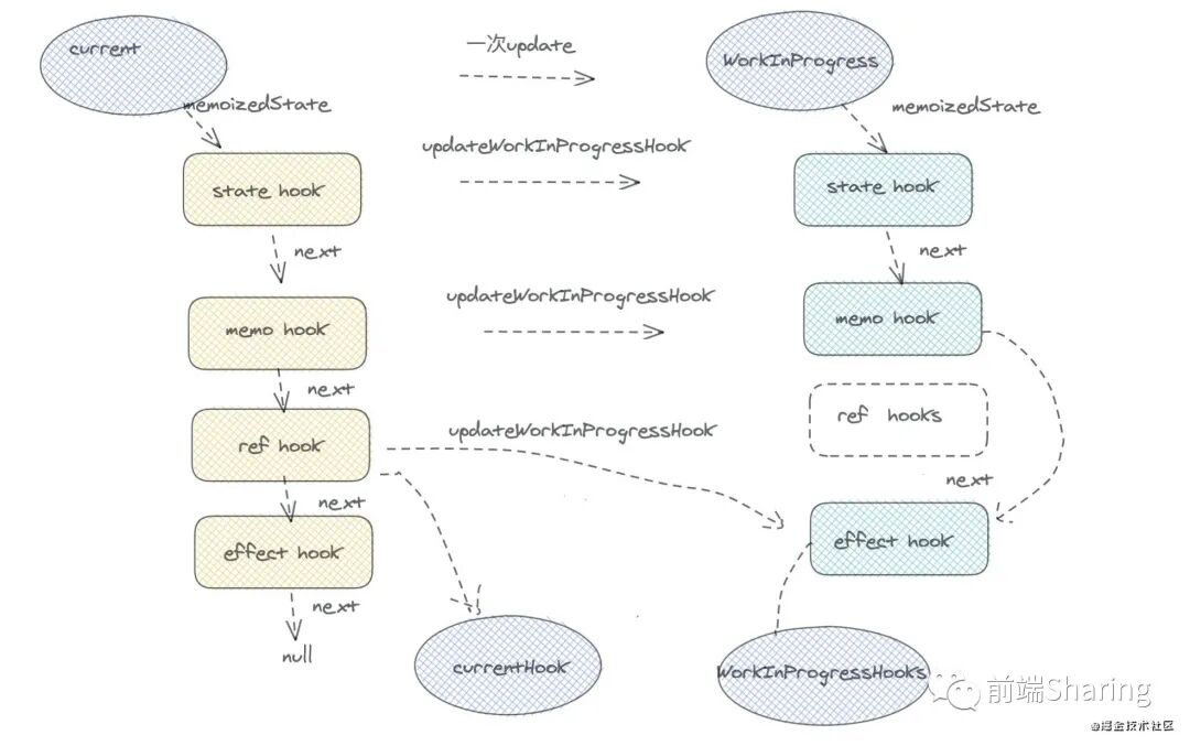 对于一次函数组件更新,当再次执行hooks函数的时候,比如 useState(0) ,首先要从current的hooks中找到与当前workInProgressHook,对应的currentHooks,然后复制一份currentHooks给workInProgressHook, 接下来hooks函数执行的时候, 把最新的状态更新到workInProgressHook,保证hooks状态不丢失。