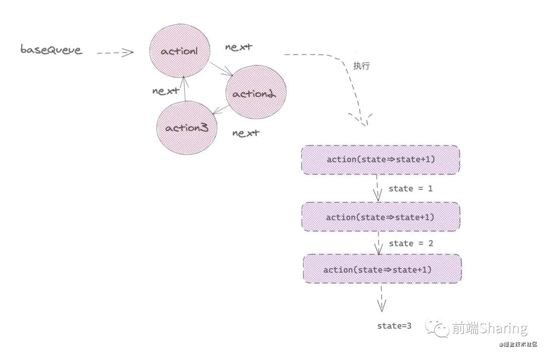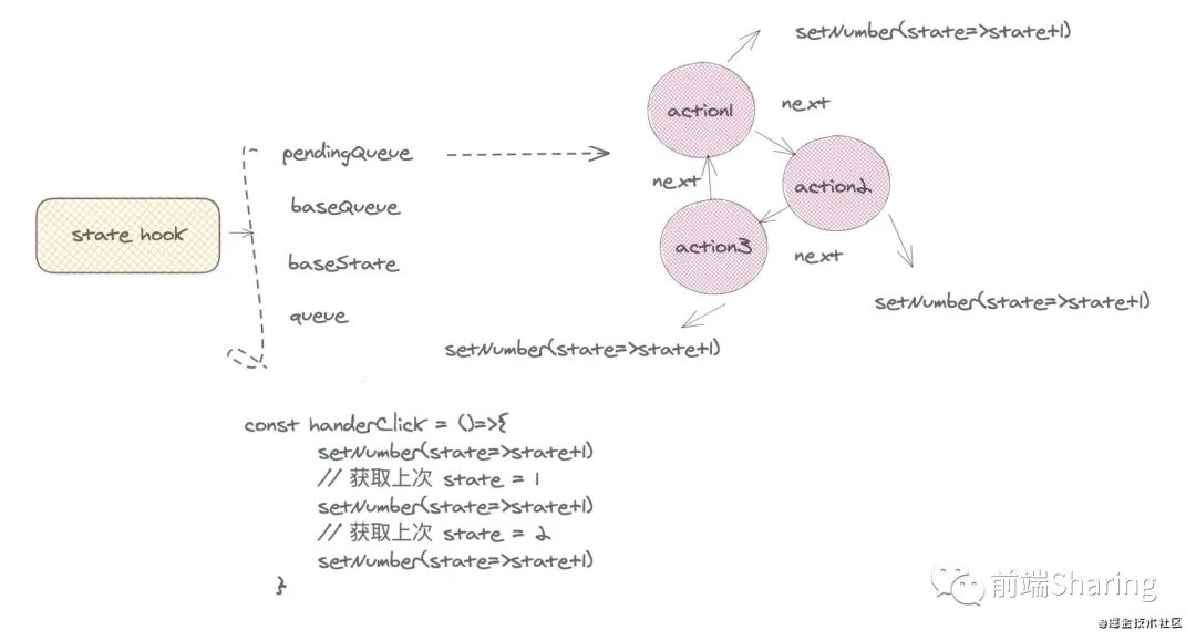三次setNumber产生的update会暂且放入pending queue,在下一次函数组件执行时候,三次 update被合并到 baseQueue。结构如下图: