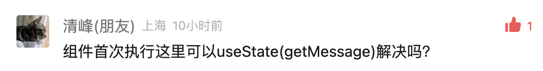 + var [, setPromise] = useState(getMessage)- var [, setPromise] = useState(getMessage())这里就是我们这篇文章要重点给大家介绍的非常巧妙的地方。我们借助了 useState 的另外一种方式来初始化。来观察一下官方文档的案例