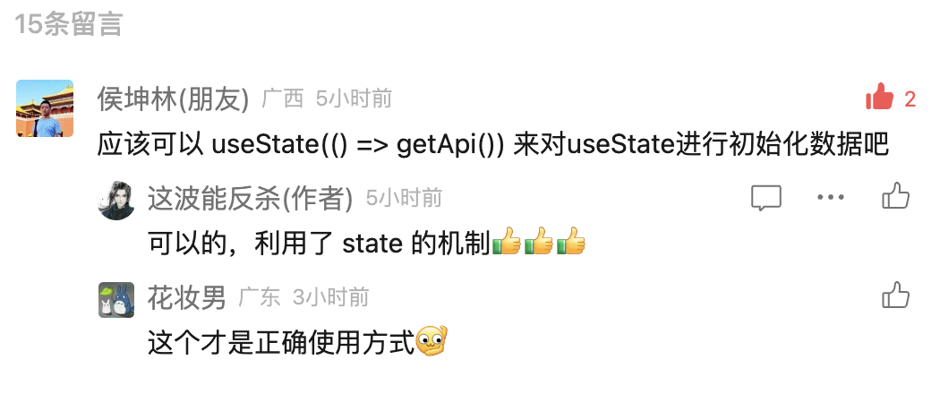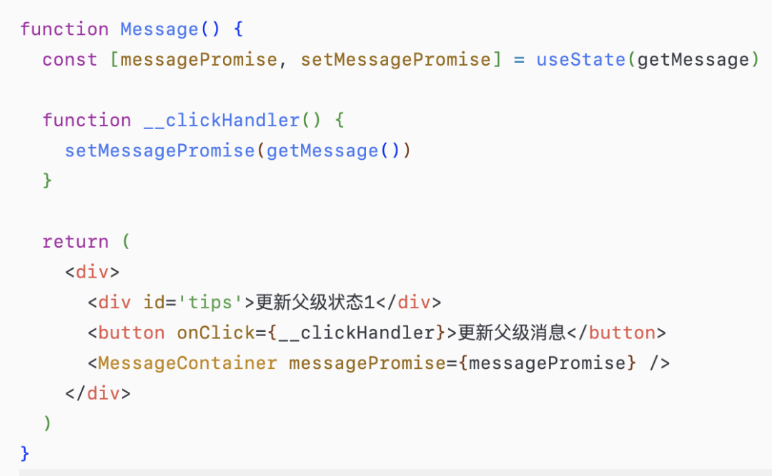 function __clickHandler() { setPromise(getMessage())}这种用法非常高级,因为在我们的固有思维中,state 中存储的都是可以触发更新的状态 / 数据,而这种用法实际上是在数据外套了一层 promise,我们将数据存储在 promise 中。在保持了代码简洁性的同时,没有新增状态并且最终解决了问题。