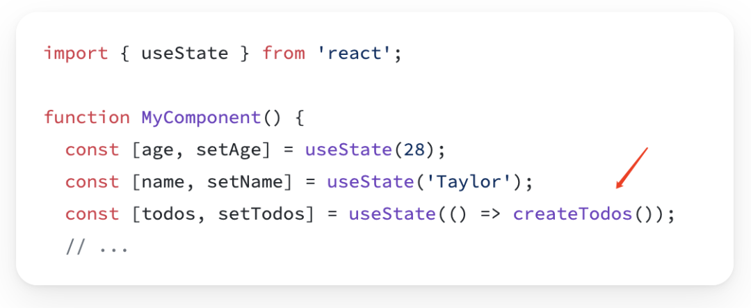 const [todos, setTodos] = useState(createTodos);所以此时,我们使用 useState(getMessage) 则是借用了这种语法思路,将我们的代码做到极简的方式给 state 赋值。他等价于