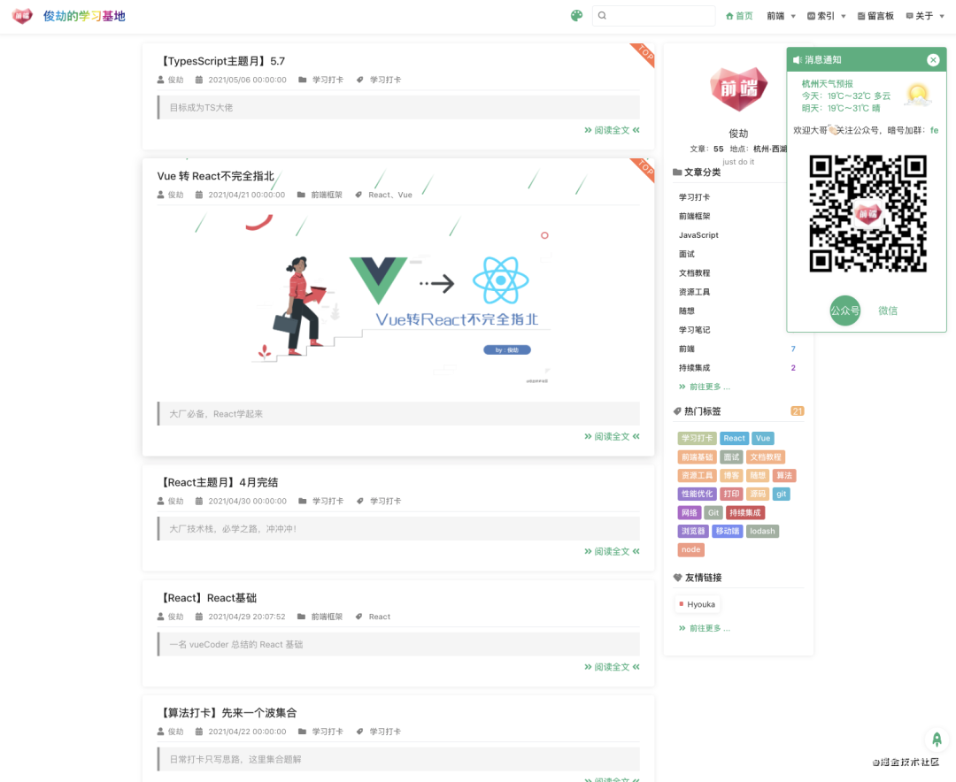 首发个人博客 , 个人学习的所有笔记,以及各种前端资源分享,有兴趣的老哥可以看看,顺手start 一下下。如果你也想搭建一个类似的博客,博客里面也都有教程,从头到尾全免费。博客中有公众号,欢迎各位一起,每天学习打卡,共同进步!