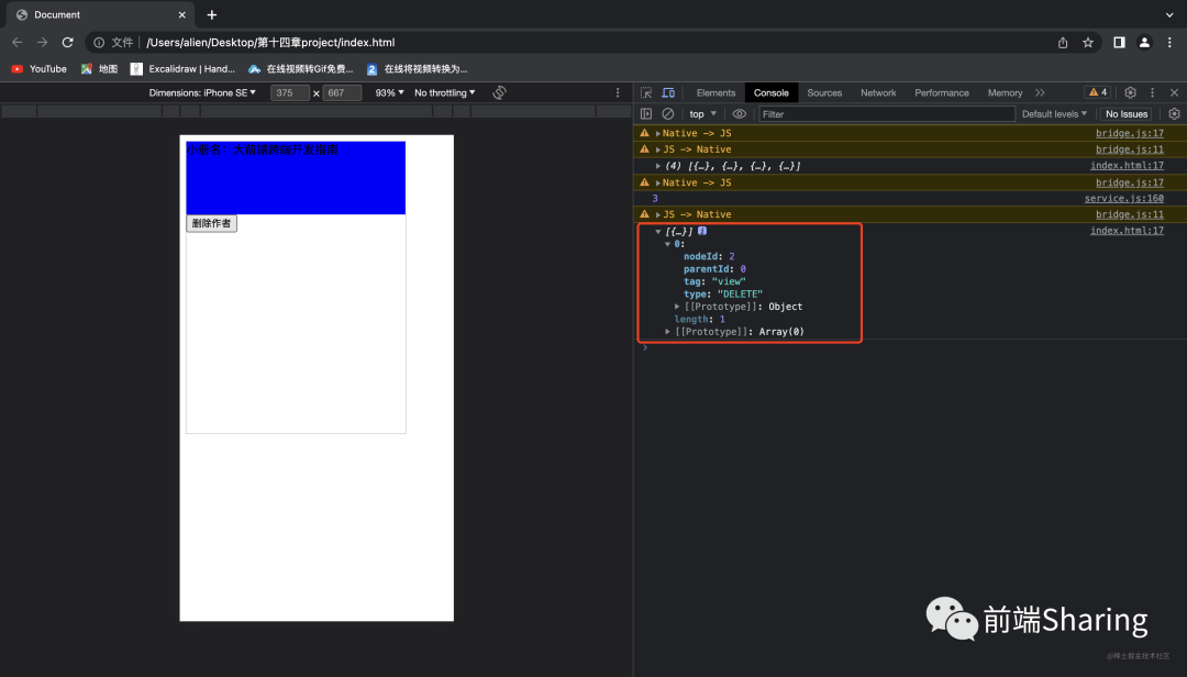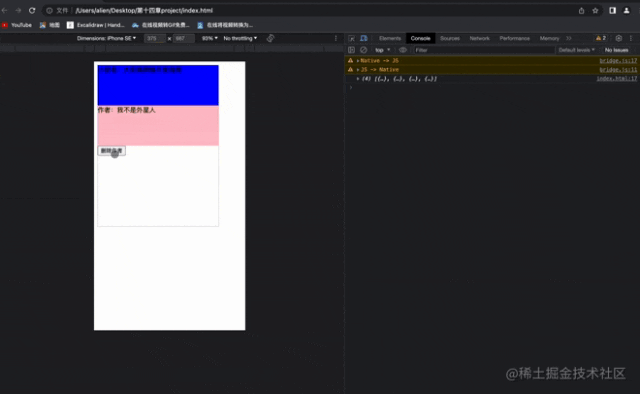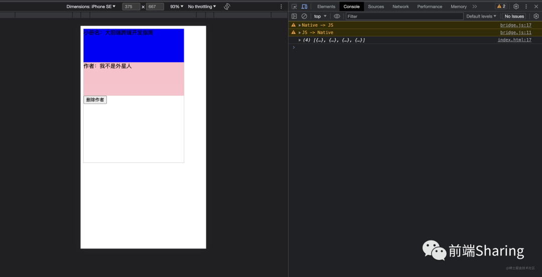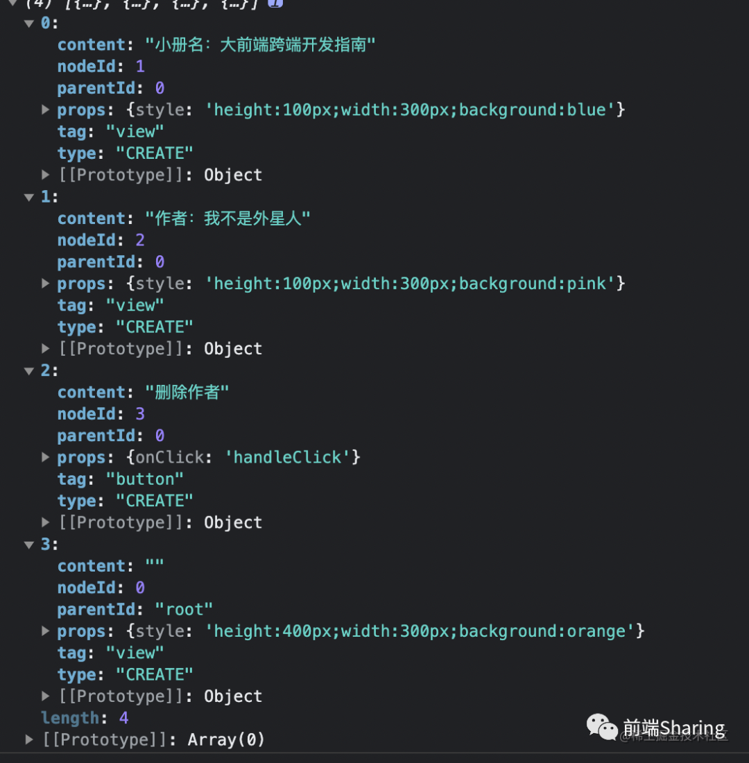 class Home extends Component{ state={ show:true } handleClick(){ this.setState({ show:false }) } render(){ const { show } = this.state return createNode('view',{ style:'height:400px;width:300px;border:1px solid #ccc;' }, [ createNode('view',{ style:'height:100px;width:300px;background:blue' }, '小册名:大前端跨端开发指南'), show && createNode('view',{ style:'height:100px;width:300px;background:pink' }, '作者:我不是外星人'), createNode('button',{ onClick: this.handleClick }, '删除作者') ] ) }}在 React 中,用 createElment 来描述视图结构,但是本次实现的是以 React 语法做 DSL 应用,本质上并不是 React,(语法一样,但是实现完全不同)所以这里我们直接用 createNode 来代替。createNode 实现非常简单如下: