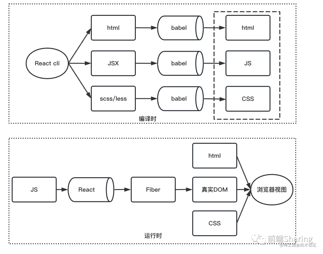 编译时:我们描述一下整个流程,首先通过 React cli 可以是 react-create-app,来编译解析 jsx ,scss/less 等文件,jsx 语法会变成 React.createElement 的形式。最终形成 html,css,js 等浏览器能够识别的文件。