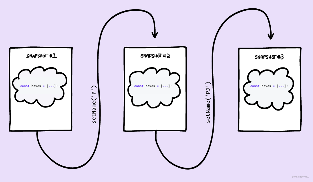 每一次 重新渲染 都是一次快照,它基于当前应用程序的状态告诉了应用程序的 UI 在某一特定时刻应该是什什么样的。我们可以把它想象成一叠照片,每张照片都记录了在每个状态变量的特定值下事物的样子。