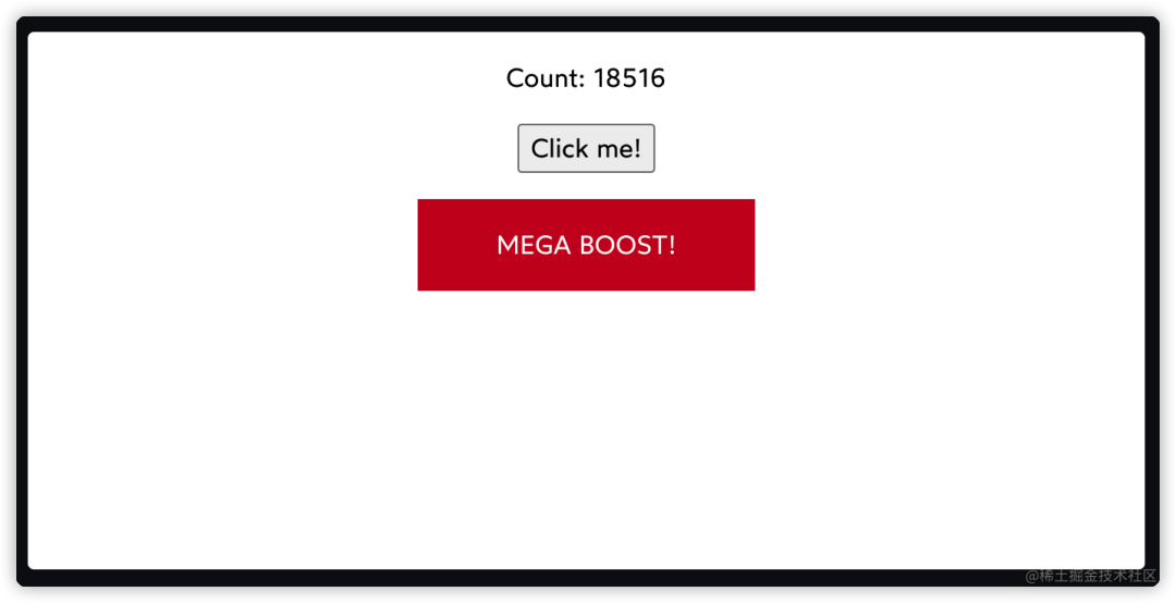 //App.jsximport React from 'react';import MegaBoost from './MegaBoost';function App() { const [count, setCount] = React.useState(0); function handleMegaBoost() { setCount((currentValue) => currentValue + 1234); } return ( <> Count: {count} <button onClick={() => { setCount(count + 1) }} > Click me! </button> <MegaBoost handleClick={handleMegaBoost} /> </> );}export default App;// MegaBoost.jsximport React from 'react';function MegaBoost({ handleClick }) { console.log('Render MegaBoost'); return ( <button class onClick={handleClick} > MEGA BOOST! </button> );}export default React.memo(MegaBoost);效果如图: