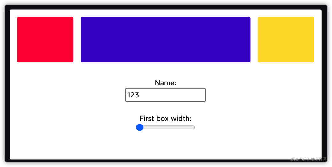 // App.jsximport React from 'react';import Boxes from './Boxes';function App() { const [name, setName] = React.useState(''); const [boxWidth, setBoxWidth] = React.useState(1); const id = React.useId(); // Try changing some of these values! const boxes = [ { flex: boxWidth, background: 'hsl(345deg 100% 50%)' }, { flex: 3, background: 'hsl(260deg 100% 40%)' }, { flex: 1, background: 'hsl(50deg 100% 60%)' }, ]; return ( <> <Boxes boxes={boxes} /> <section> <label htmlFor={`${id}-name`}> Name: </label> <input id={`${id}-name`} type="text" value={name} onChange={(event) => { setName(event.target.value); }} /> <label htmlFor={`${id}-box-width`}> First box width: </label> <input id={`${id}-box-width`} type="range" min={1} max={5} step={0.01} value={boxWidth} onChange={(event) => { setBoxWidth(Number(event.target.value)); }} /> </section> </> );}export default App;//Boxes.jsximport React from 'react';function Boxes({ boxes }) { return ( <div class> {boxes.map((boxStyles, index) => ( <div key={index} class style={boxStyles} /> ))} </div> );}export default React.memo(Boxes);效果如下图: