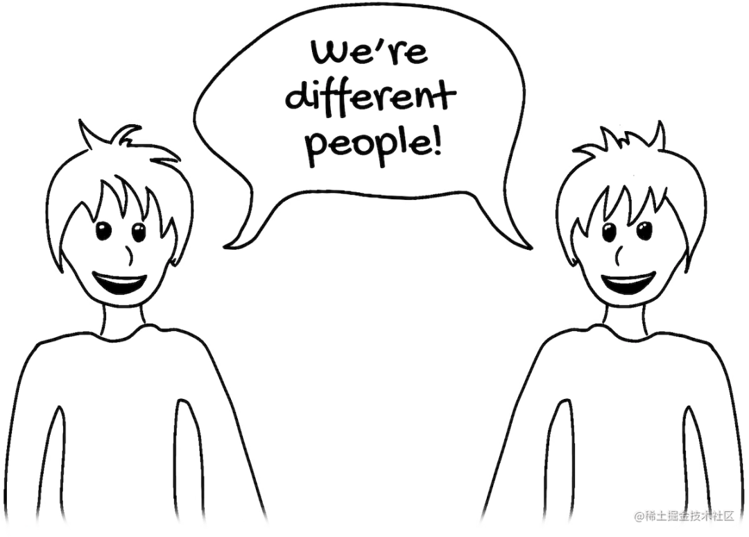 我们创建了两个不同的数组。它们可能包含相同的内容,但它们不是同一个数组,就像 两个同卵双胞胎不是同一个人一样。