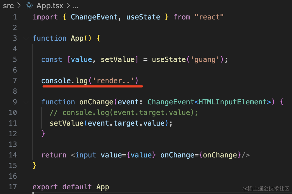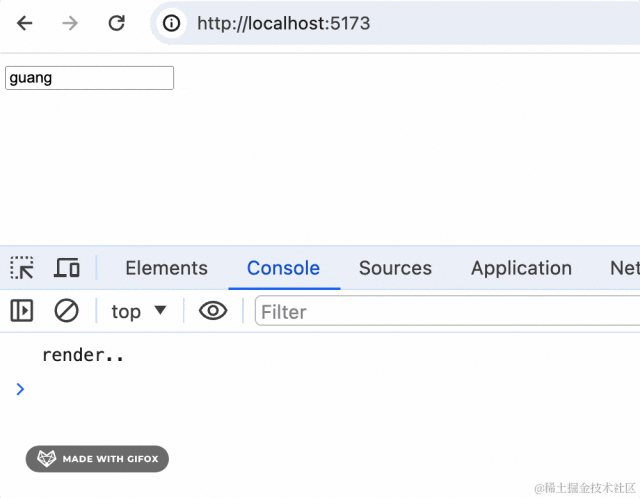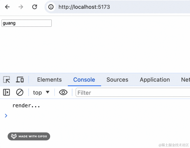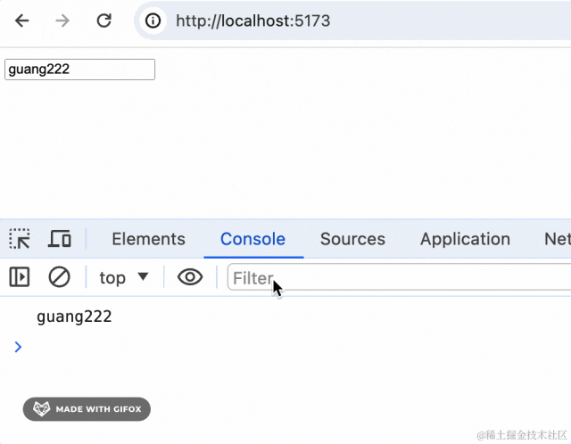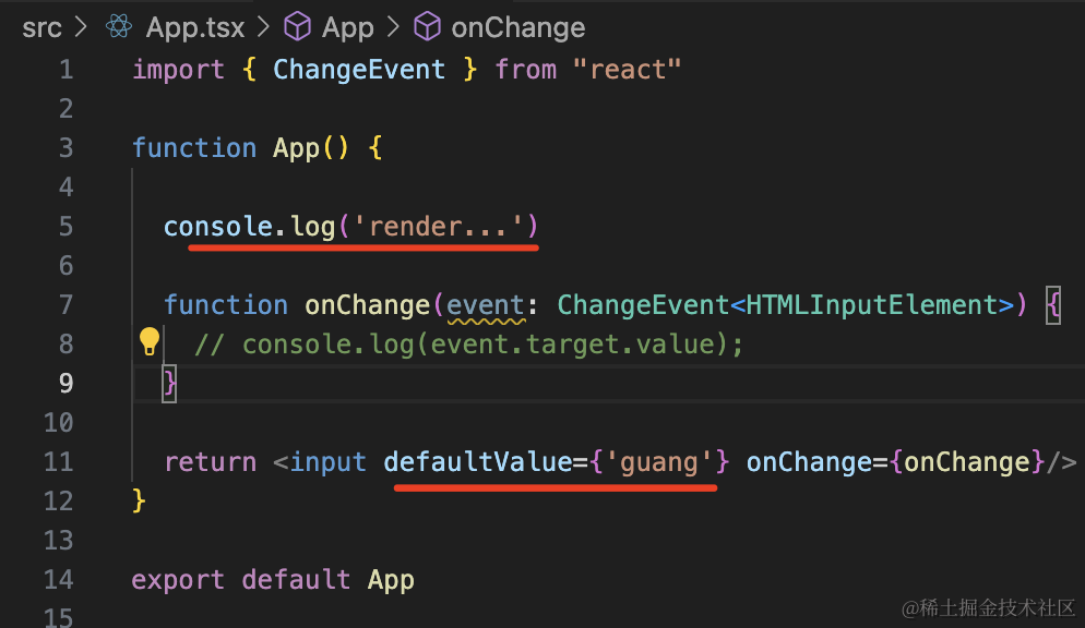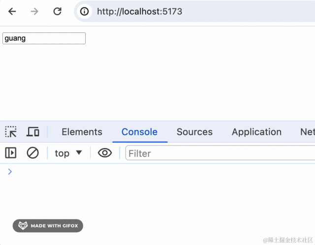 import { ChangeEvent } from "react"function App() { function onChange(event: ChangeEvent<HTMLInputElement>) { console.log(event.target.value); } return <input defaultValue={'guang'} onChange={onChange}/>}export default App跑一下开发服务: