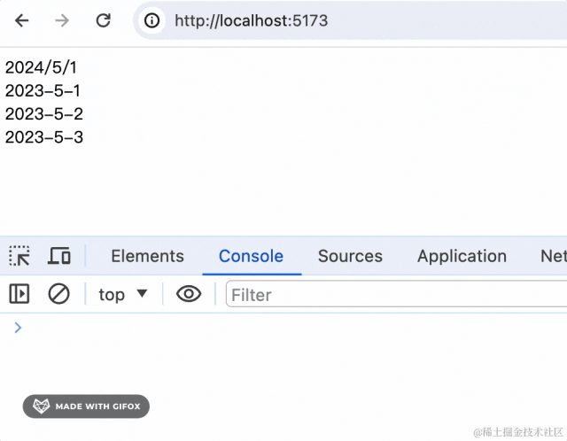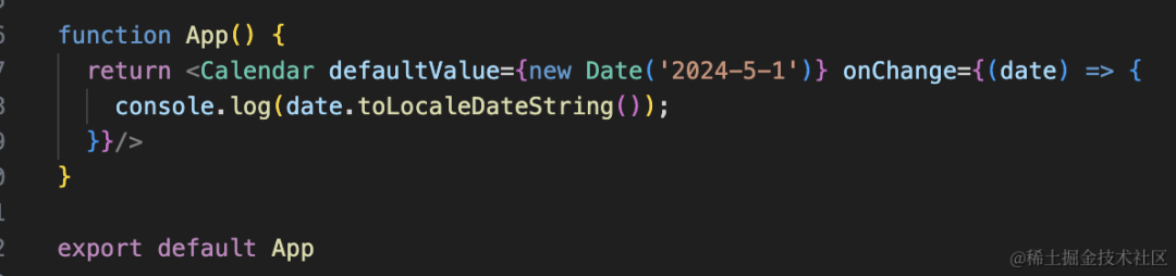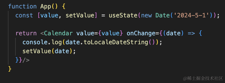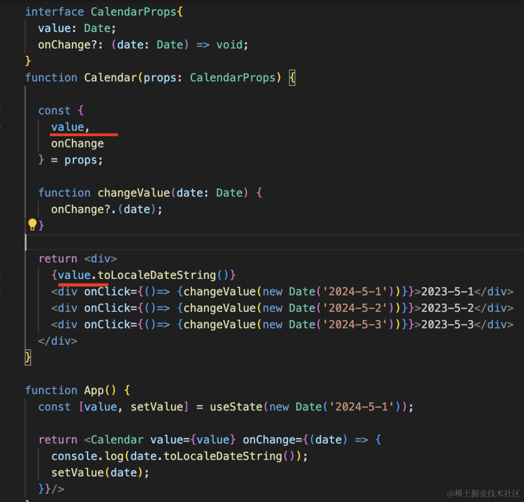 import { ChangeEvent, useEffect, useState } from "react"interface CalendarProps{ value: Date; onChange?: (date: Date) => void;}function Calendar(props: CalendarProps) { const { value, onChange } = props; function changeValue(date: Date) { onChange?.(date); } return <div> {value.toLocaleDateString()} <div onClick={()=> {changeValue(new Date('2024-5-1'))}}>2023-5-1</div> <div onClick={()=> {changeValue(new Date('2024-5-2'))}}>2023-5-2</div> <div onClick={()=> {changeValue(new Date('2024-5-3'))}}>2023-5-3</div> </div>}function App() { const [value, setValue] = useState(new Date('2024-5-1')); return <Calendar value={value} onChange={(date) => { console.log(date.toLocaleDateString()); setValue(date); }}/>}export default App直接用 props 传入的 value,然后切换日期的时候回调 onChange 函数: