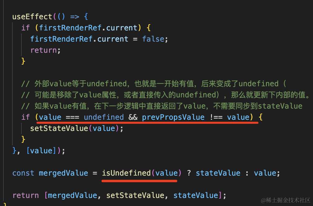 当不是首次渲染,但 value 变为 undefined 的情况,也就是从受控模式切换到了非受控模式,要同步设置 state 为 propsValue。