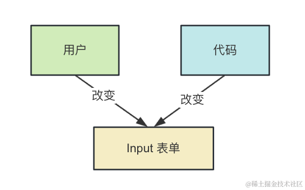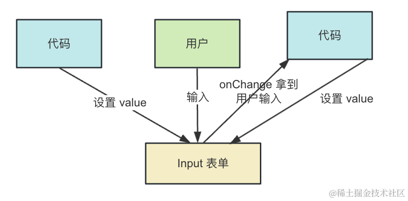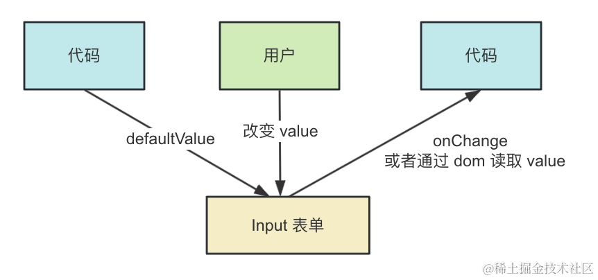 代码设置表单的初始 value,但是能改变 value 的只有用户,代码通过监听 onChange 来拿到最新的值,或者通过 ref 拿到 dom 之后读取 value。