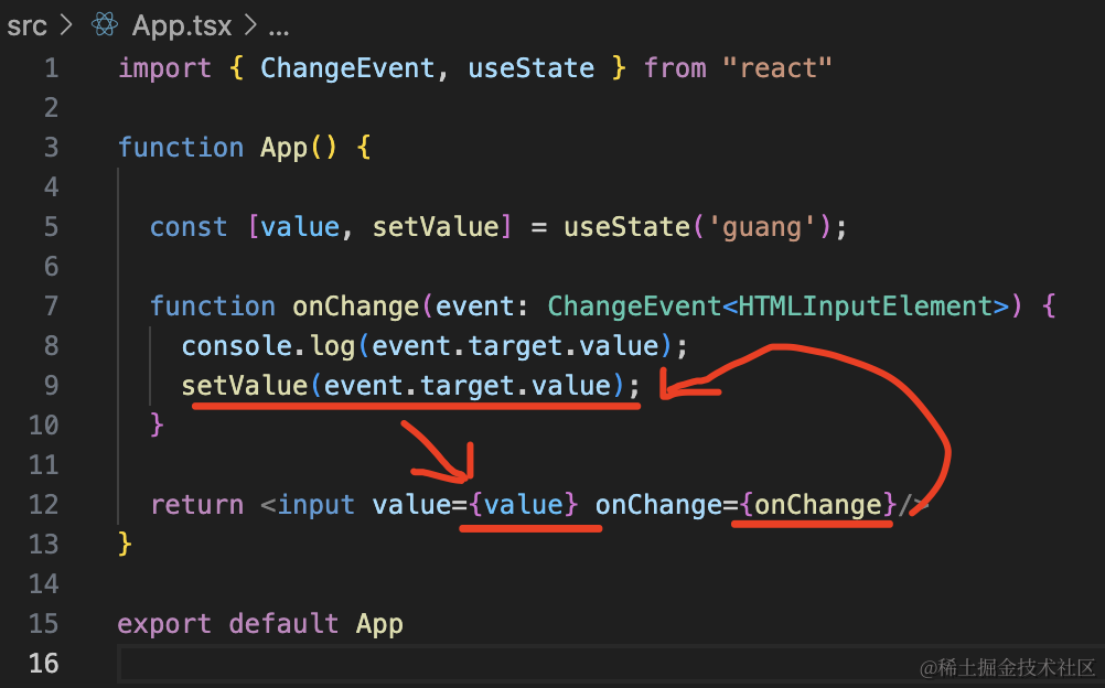 import { ChangeEvent, useState } from "react"function App() { const [value, setValue] = useState('guang'); function onChange(event: ChangeEvent<HTMLInputElement>) { console.log(event.target.value) setValue(event.target.value.toUpperCase()); } return <input value={value} onChange={onChange}/>}export default App这种,需要把用户的输入修改一下再设置 value 的。