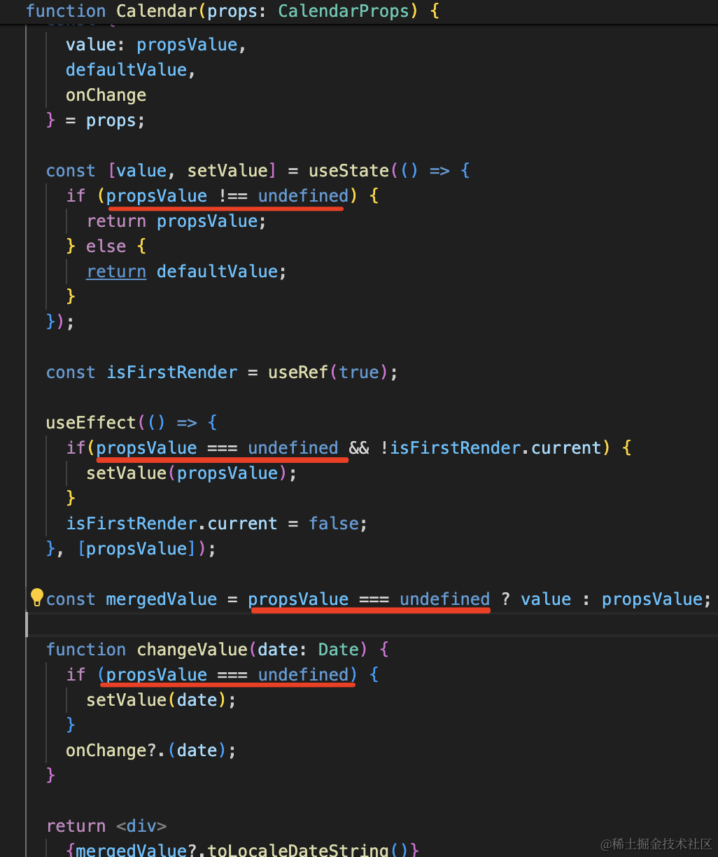 import { useEffect, useRef, useState } from "react"interface CalendarProps{ value?: Date; defaultValue?: Date; onChange?: (date: Date) => void;}function Calendar(props: CalendarProps) { const { value: propsValue, defaultValue, onChange } = props; const [value, setValue] = useState(() => { if (propsValue !== undefined) { return propsValue; } else { return defaultValue; } }); const isFirstRender = useRef(true); useEffect(() => { if(propsValue === undefined && !isFirstRender.current) { setValue(propsValue); } isFirstRender.current = false; }, [propsValue]); const mergedValue = propsValue === undefined ? value : propsValue; function changeValue(date: Date) { if (propsValue === undefined) { setValue(date); } onChange?.(date); } return <div> {mergedValue?.toLocaleDateString()} <div onClick={()=> {changeValue(new Date('2024-5-1'))}}>2023-5-1</div> <div onClick={()=> {changeValue(new Date('2024-5-2'))}}>2023-5-2</div> <div onClick={()=> {changeValue(new Date('2024-5-3'))}}>2023-5-3</div> </div>}function App() { return <Calendar defaultValue={new Date('2024-5-1')} onChange={(date) => { console.log(date.toLocaleDateString()); }}/>}export default App参数同时支持 value 和 defaultValue,通过判断 value 是不是 undefined 来区分受控模式和非受控模式。
