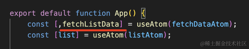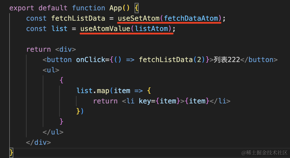 import { atom, useAtom, useAtomValue, useSetAtom } from 'jotai'; async function getListById(id) { const data = { 1: ['a1', 'a2', 'a3'], 2: ['b1', 'b2', 'b3', 'b4'] } return new Promise((resolve) => { setTimeout(() => { resolve(data[id]); }, 2000); });}const listAtom = atom([]);const dataAtom = atom((get) => { return get(listAtom);}, async (get, set, param) => { const data = await getListById(param); set(listAtom, data);});export default function App() { const [list, fetchListData] = useAtom(dataAtom); return <div> <button onClick={() => fetchListData(2)}>列表222</button> <ul> { list.map(item => { return <li key={item}>{item}</li> }) } </ul> </div>}此外,用 useSetAtom 有时候可以起到性能优化的作用。