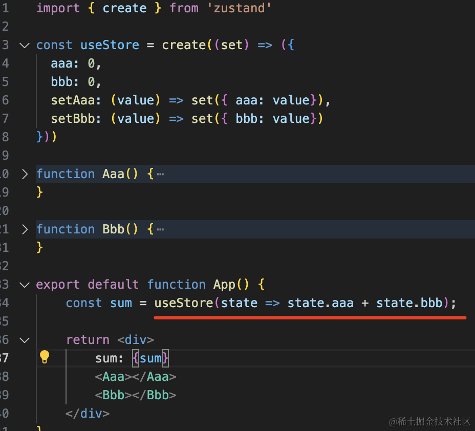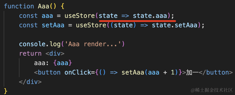 import { create } from 'zustand'const useStore = create((set) => ({ aaa: 0, bbb: 0, setAaa: (value) => set({ aaa: value}), setBbb: (value) => set({ bbb: value})}))function Aaa() { const aaa = useStore(state => state.aaa); const setAaa = useStore((state) => state.setAaa); console.log('Aaa render...') return <div> aaa: {aaa} <button onClick={() => setAaa(aaa + 1)}>加一</button> </div>}function Bbb() { const bbb = useStore(state => state.bbb); const setBbb = useStore((state) => state.setBbb); console.log('Bbb render...') return <div> bbb: {bbb} <button onClick={() => setBbb(bbb + 1)}>加一</button> </div>}export default function App() { return <div> <Aaa></Aaa> <Bbb></Bbb> </div>}store 里定义全部的 state,然后在组件里选出一部分来用。