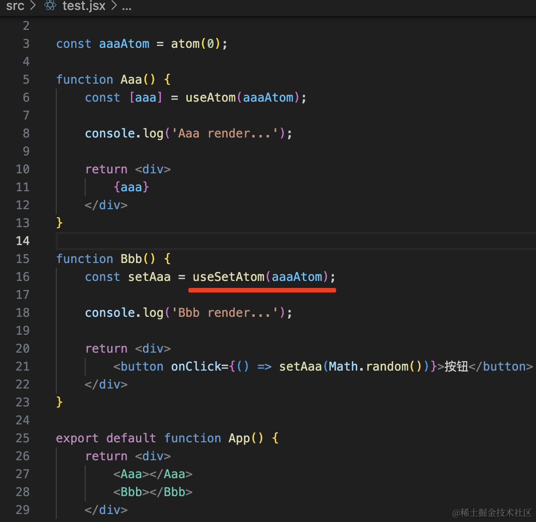import { atom, useAtom, useAtomValue, useSetAtom } from 'jotai'; const aaaAtom = atom(0);function Aaa() { const [aaa] = useAtom(aaaAtom); console.log('Aaa render...'); return <div> {aaa} </div>}function Bbb() { const [, setAaa] = useAtom(aaaAtom); console.log('Bbb render...'); return <div> <button onClick={() => setAaa(Math.random())}>按钮</button> </div>}export default function App() { return <div> <Aaa></Aaa> <Bbb></Bbb> </div>}在 Aaa 组件里读取状态,在 Bbb 组件里修改状态。