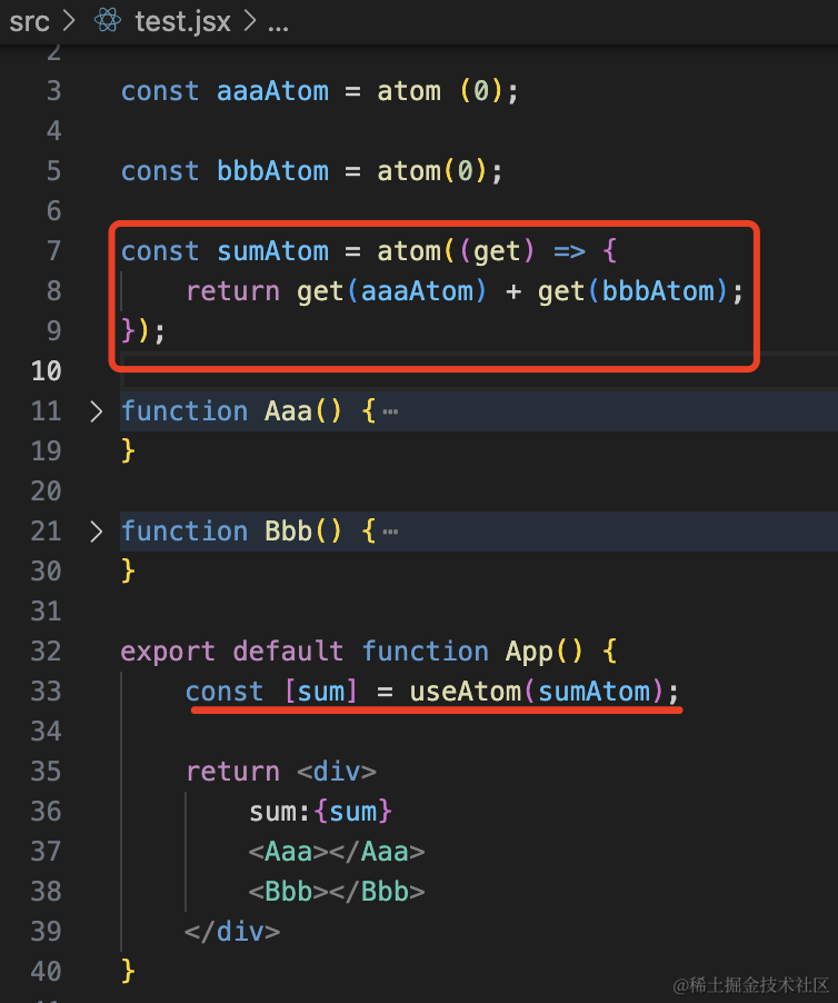 import { atom, useAtom } from 'jotai'; const aaaAtom = atom (0);const bbbAtom = atom(0);function Aaa() { const [aaa, setAaa]= useAtom(aaaAtom); console.log('Aaa render...') return <div> aaa: {aaa} <button onClick={() => setAaa(aaa + 1)}>加一</button> </div>}function Bbb() { const [bbb, setBbb]= useAtom(bbbAtom); console.log('Bbb render...') return <div> bbb: {bbb} <button onClick={() => setBbb(bbb + 1)}>加一</button> </div>}export default function App() { return <div> <Aaa></Aaa> <Bbb></Bbb> </div>}状态可以组合,产生派生状态: