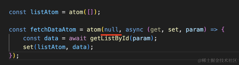import { atom, useAtom } from 'jotai'; async function getListById(id) { const data = { 1: ['a1', 'a2', 'a3'], 2: ['b1', 'b2', 'b3', 'b4'] } return new Promise((resolve) => { setTimeout(() => { resolve(data[id]); }, 2000); });}const listAtom = atom([]);const fetchDataAtom = atom(null, async (get, set, param) => { const data = await getListById(param); set(listAtom, data);});export default function App() { const [,fetchListData] = useAtom(fetchDataAtom); const [list] = useAtom(listAtom); return <div> <button onClick={() => fetchListData(2)}>列表222</button> <ul> { list.map(item => { return <li key={item}>{item}</li> }) } </ul> </div>}atom 除了可以直接传值外,也可以分别传入 get、set 函数。