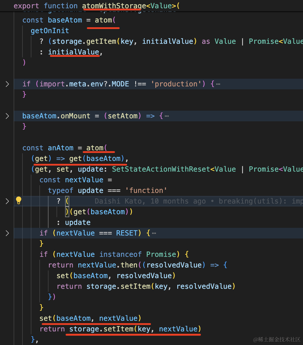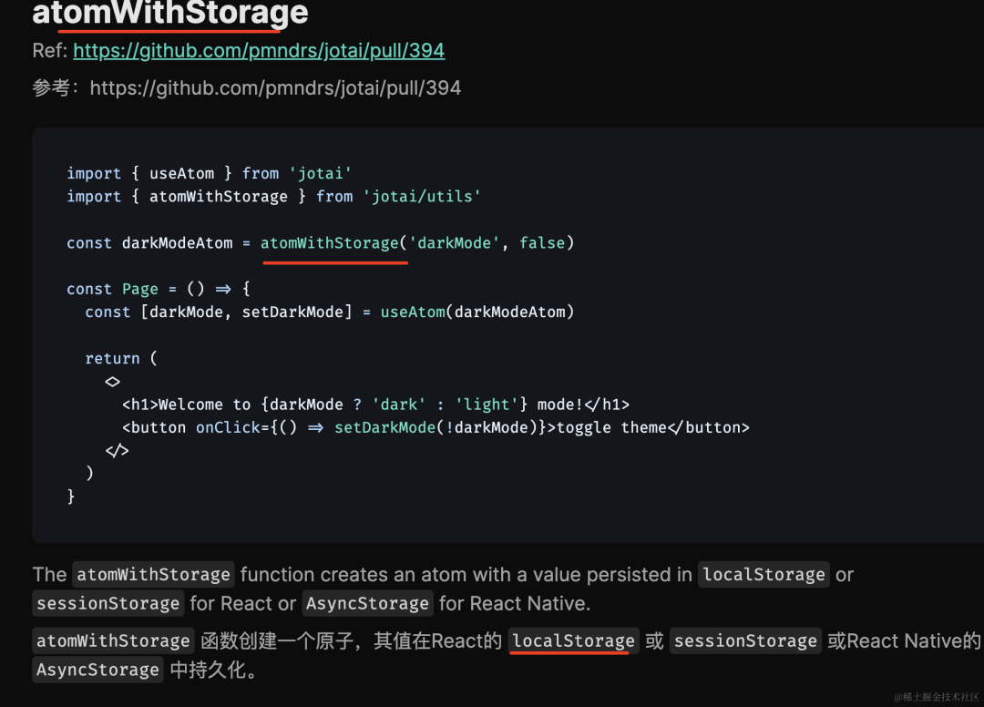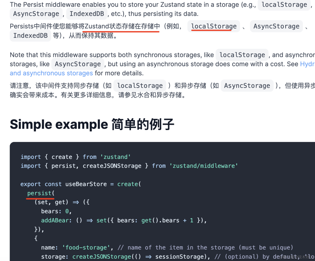 import { useAtom } from 'jotai'import { atomWithStorage } from 'jotai/utils'const countAtom = atomWithStorage('count-key2', 0)export default function App() { const [count, setCount] = useAtom(countAtom); return <div> count: {count} <button onClick={() => setCount(count + 1)}>加一</button> </div>}它是怎么实现的呢?和 zustand 的中间件有啥区别么?