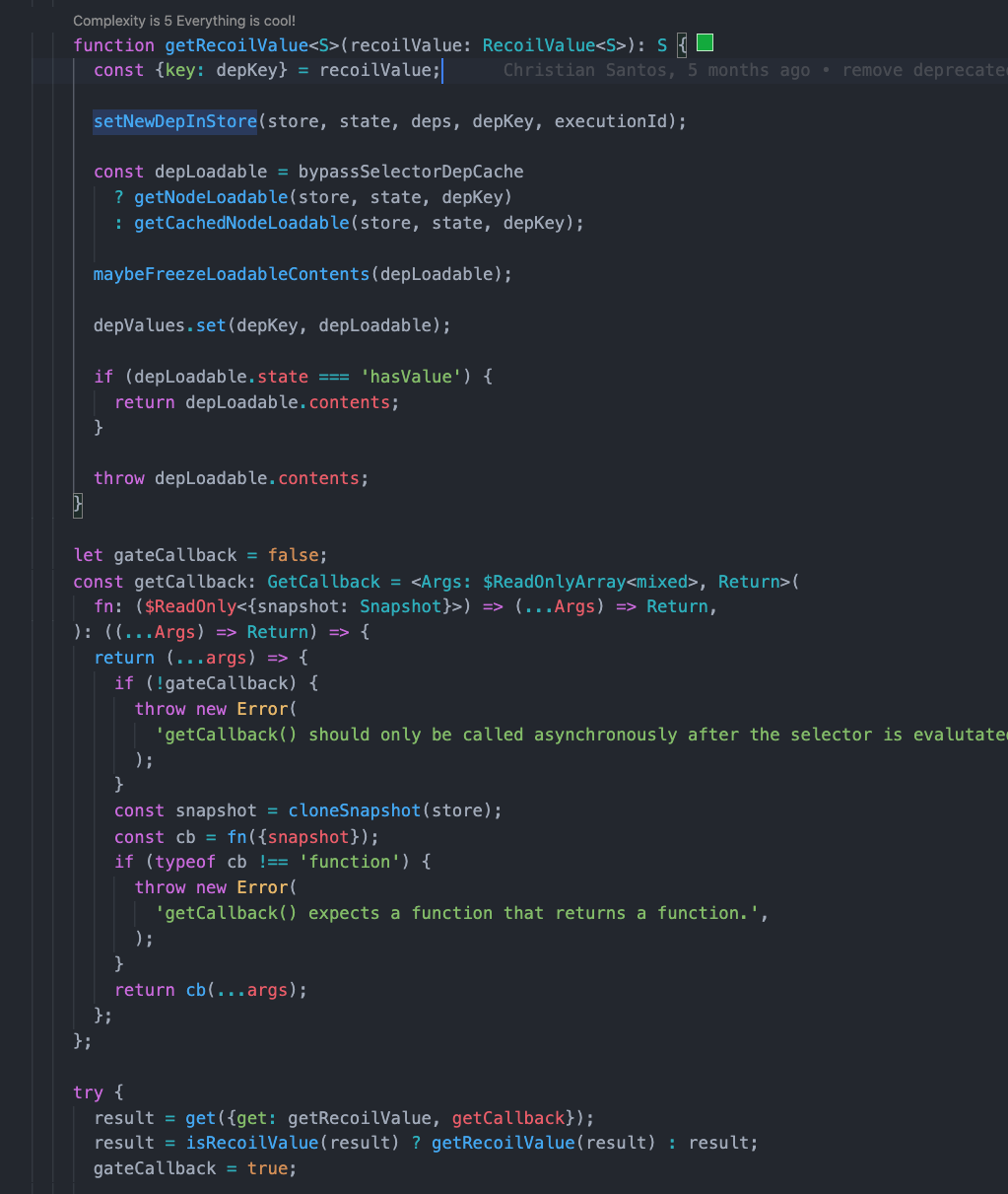 可以看到在 try...catch 里面调用了传进来的 get,同时将 getRecoilValue 作为参数传给这个 get。getRecoilValue 做了什么事情呢?