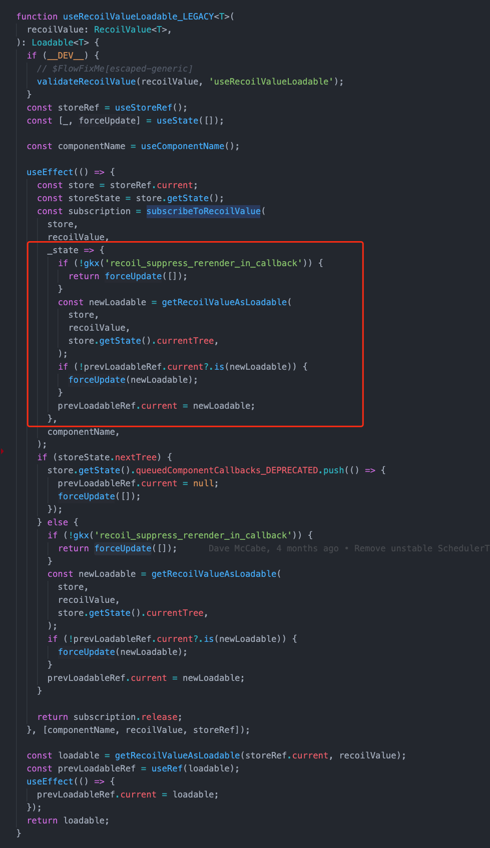 在 useRecoilValueLoadable_LEGACY 里面的实现非常巧妙。它是一个基于 useEffect 的 Hook,它通过每次给 useState 传入一个新的数组来实现组件的强制更新,并且把这个更新的逻辑存了起来。