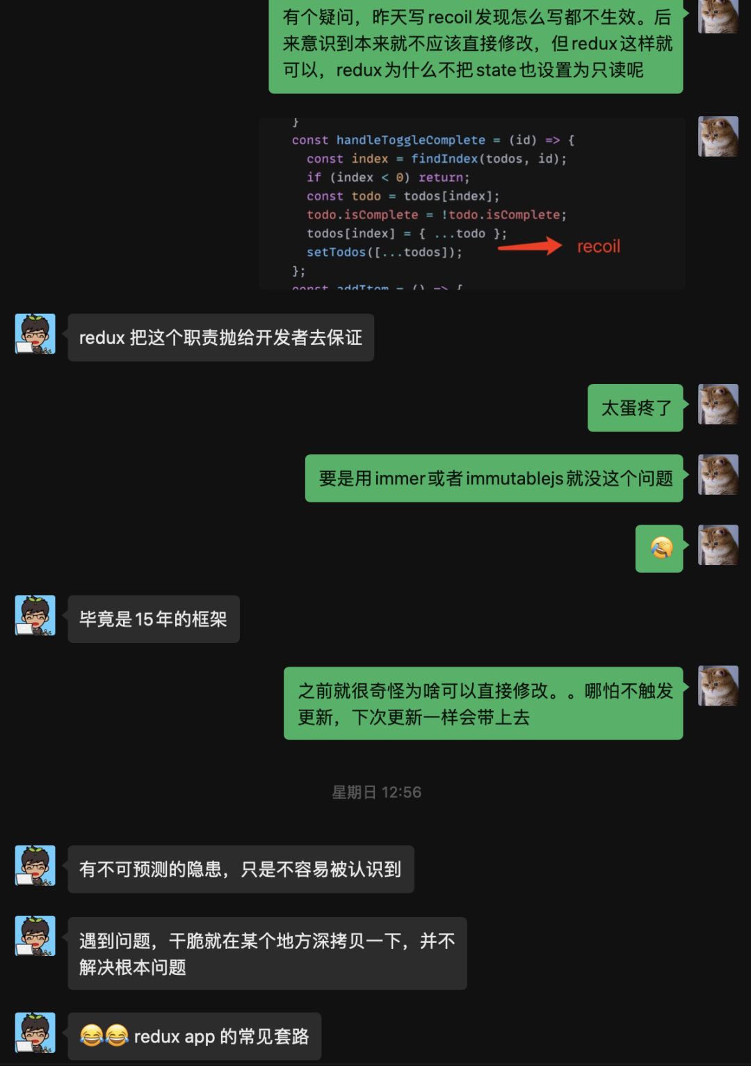 上面的这些优化点,社区早就有人想到了,rematch 已经支持了 immutable 之外的几项优化。而 Redux 最新出的 @reduxjs/toolkit 也已经支持了全部的优化点。