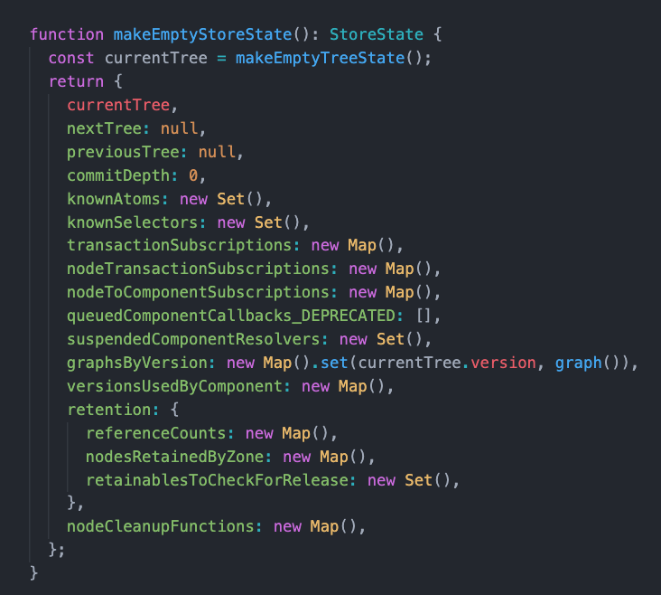 再看一下 storeState 是个什么结构,可以参考 makeEmptyStoreState方法,发现里面有很多属性,其中的 knownAtoms、knownSelectors、nodeToComponentSubscriptions 比较关键。