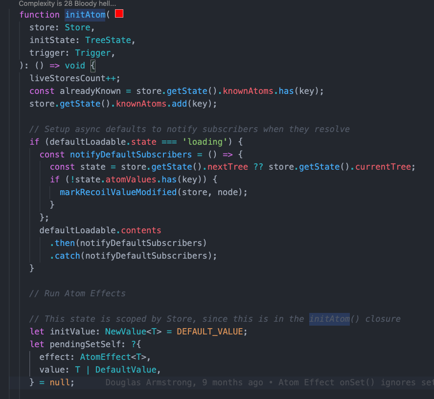 源码在 Recoil_atom.js 文件里面,返回了一个 baseAtom。在这个 baseAtom 里面,主要是定义了一些方法,其中的 initAtom 是在组件里面 get 的时候调用,用于将 atom 注册到 knownAtom 上面。这样 atom 就会被聚拢到一个大的 Store 里面。