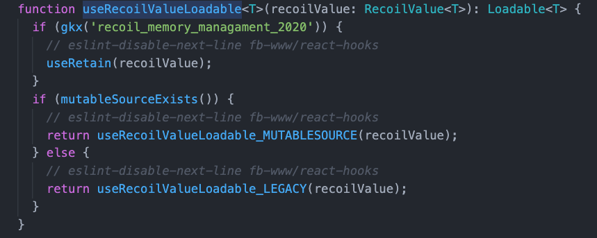 useRecoilValue 是个 Hook,它用于组件订阅 atom 变化。它的源码位置在 Recoil_Hooks.js 文件里面。主要看 useRecoilValueLoadable 这个方法。